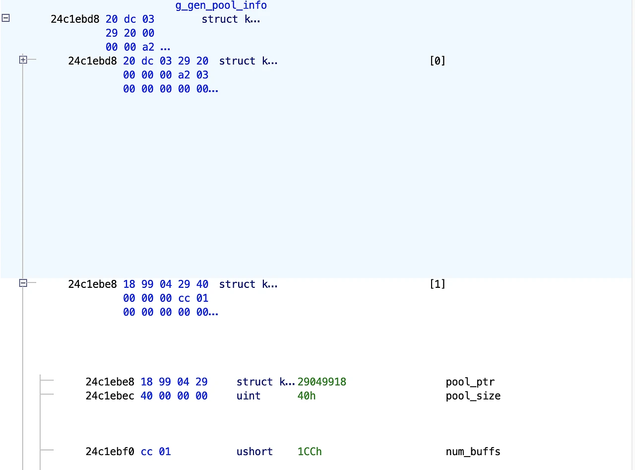 For example, here is a screenshot from Ghidra showing the tail of the final partition for a 32-size pool, the pool descriptor for a 64-size pool, and the head of the latter partition. These images are real memory snapshots generated at runtime from our custom Mediatek baseband debugger.