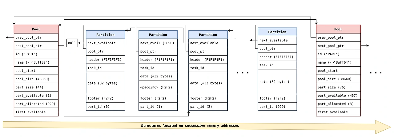- the entire heap itself is reserved at a fix location in the firmware memory layout (same address every time); each partition pool for each size is always at the same location, one after the other, with the partition pool descriptor structures always directly in front of the actual pool itself