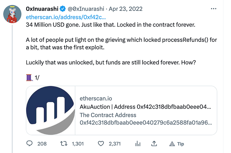 One of the most high-profile incidents was the Akutars NFT which ended up with 34 million dollars worth of ETH stuck inside the smart contract and unwithdrawable.